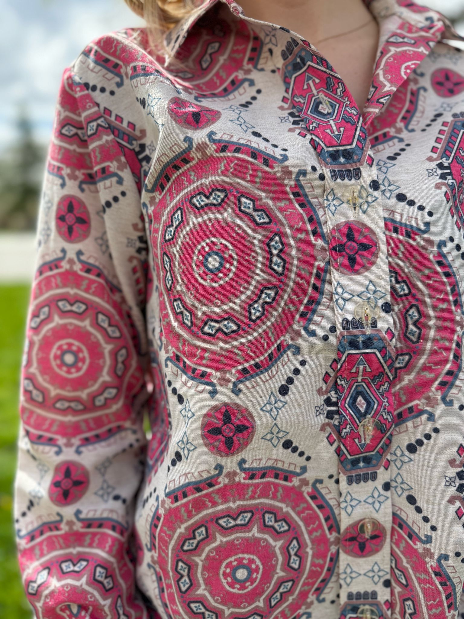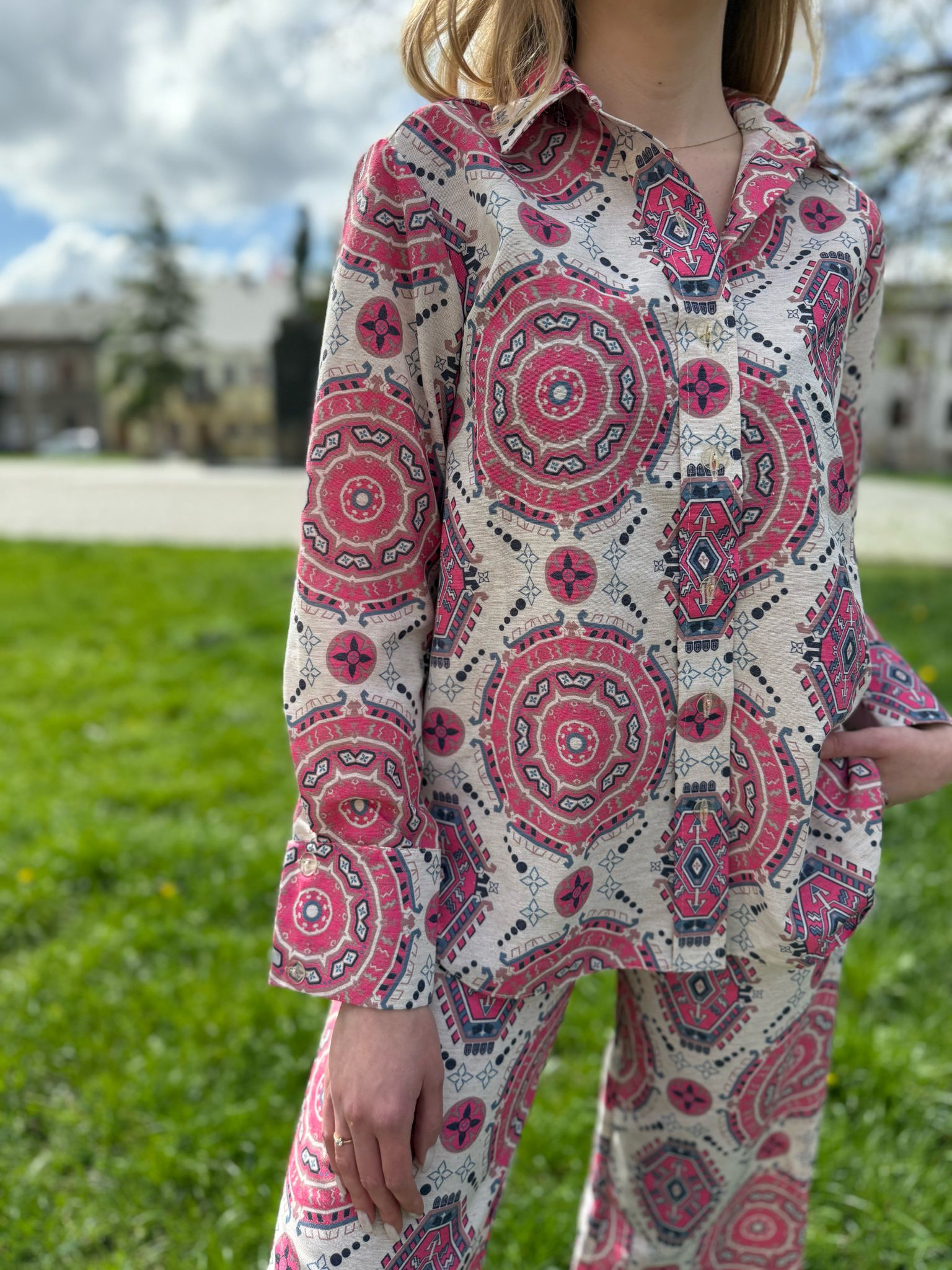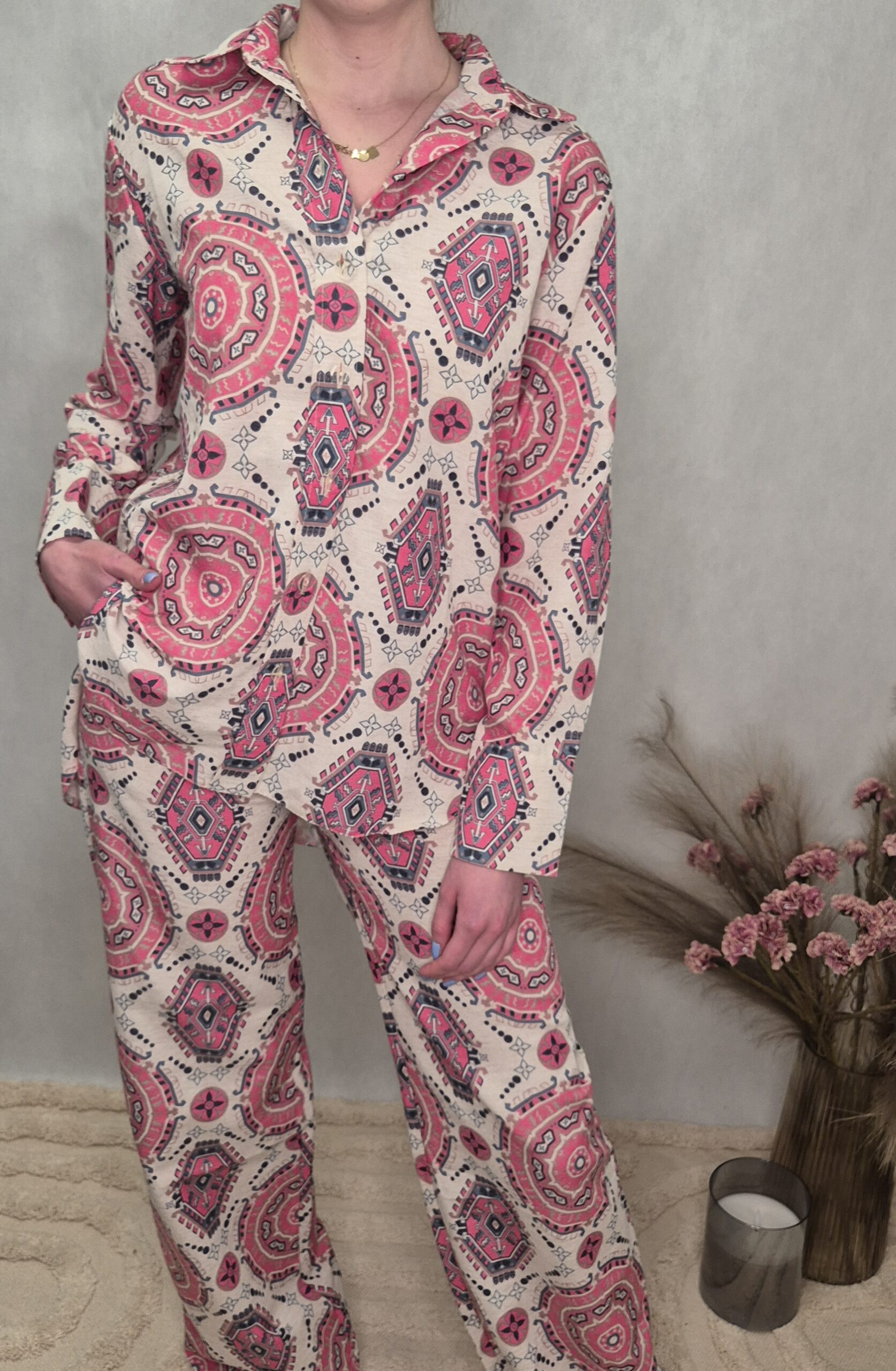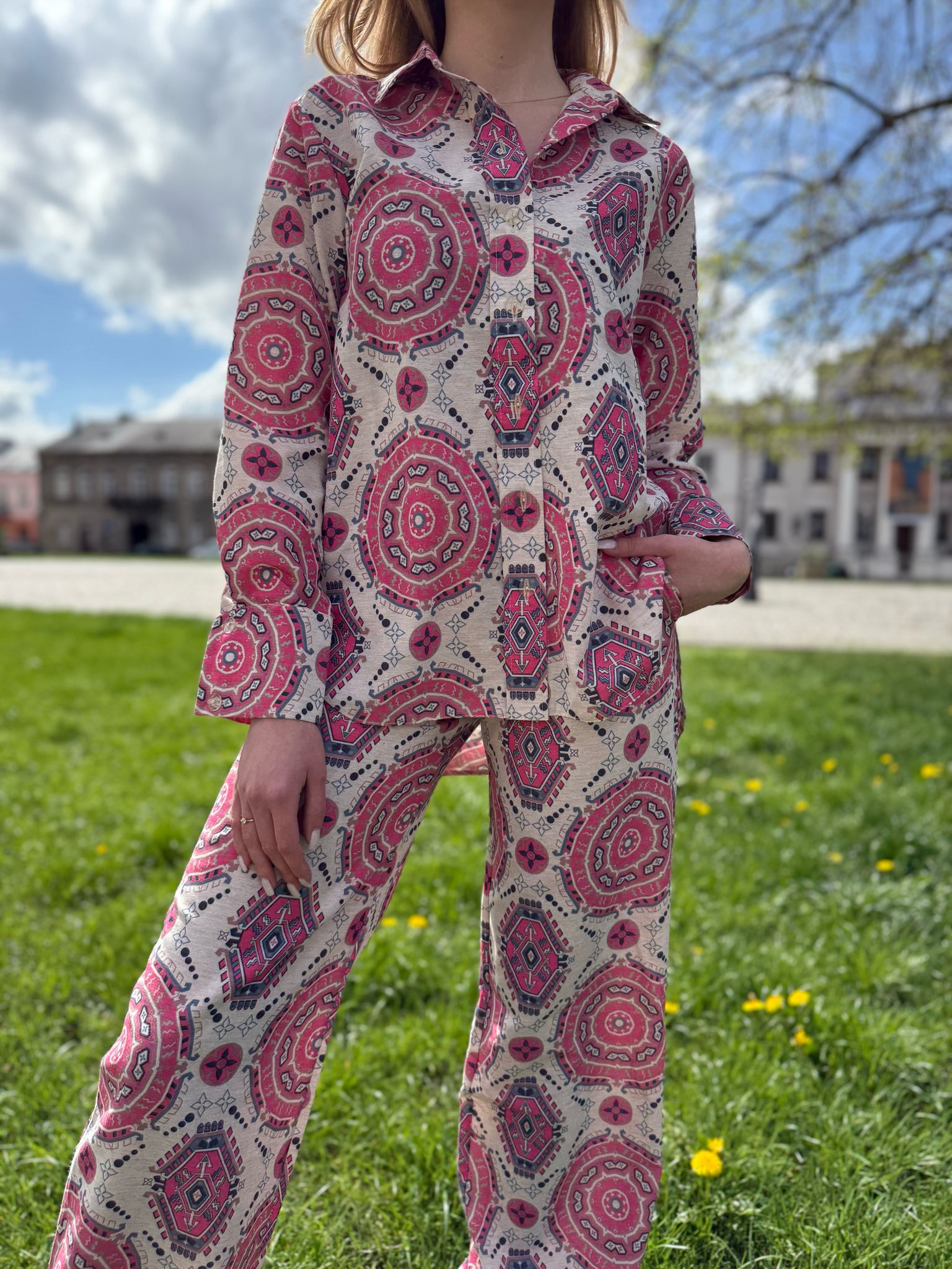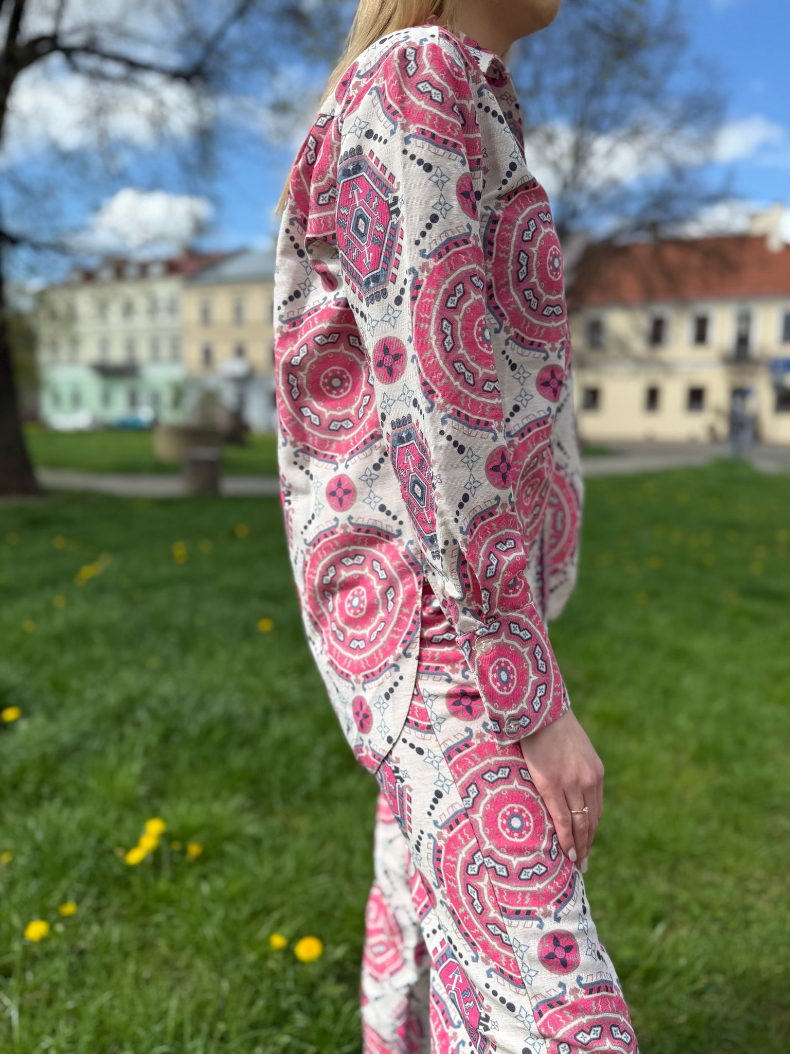 Nietypowy, pi臋kny komplet koszuli i spodni. Koszula posiada d艂ugie r臋kawy, jest zapinana na guziki. Spodnie o d艂ugich, prostych nogawkach. Komplet idealny na ciep艂e dni, gdy偶 wykonany jest w 100% z lnu.