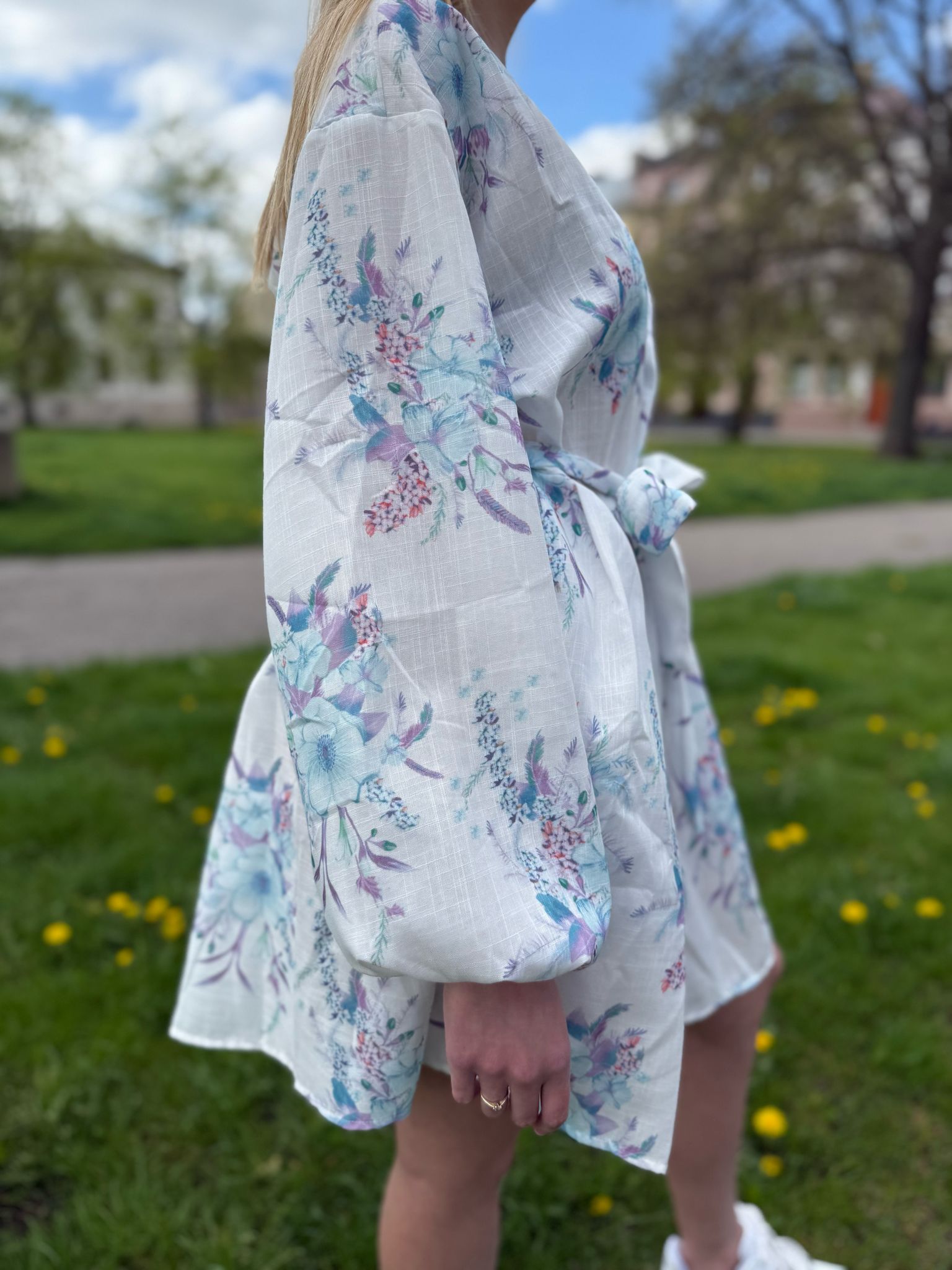 Sukienka w kwiaty. Sukienka posiada pasek do przewiązania w talii. Ma szerokie, bufiaste rękawy. Dekolt w serek, posiada rozpinane guziki.