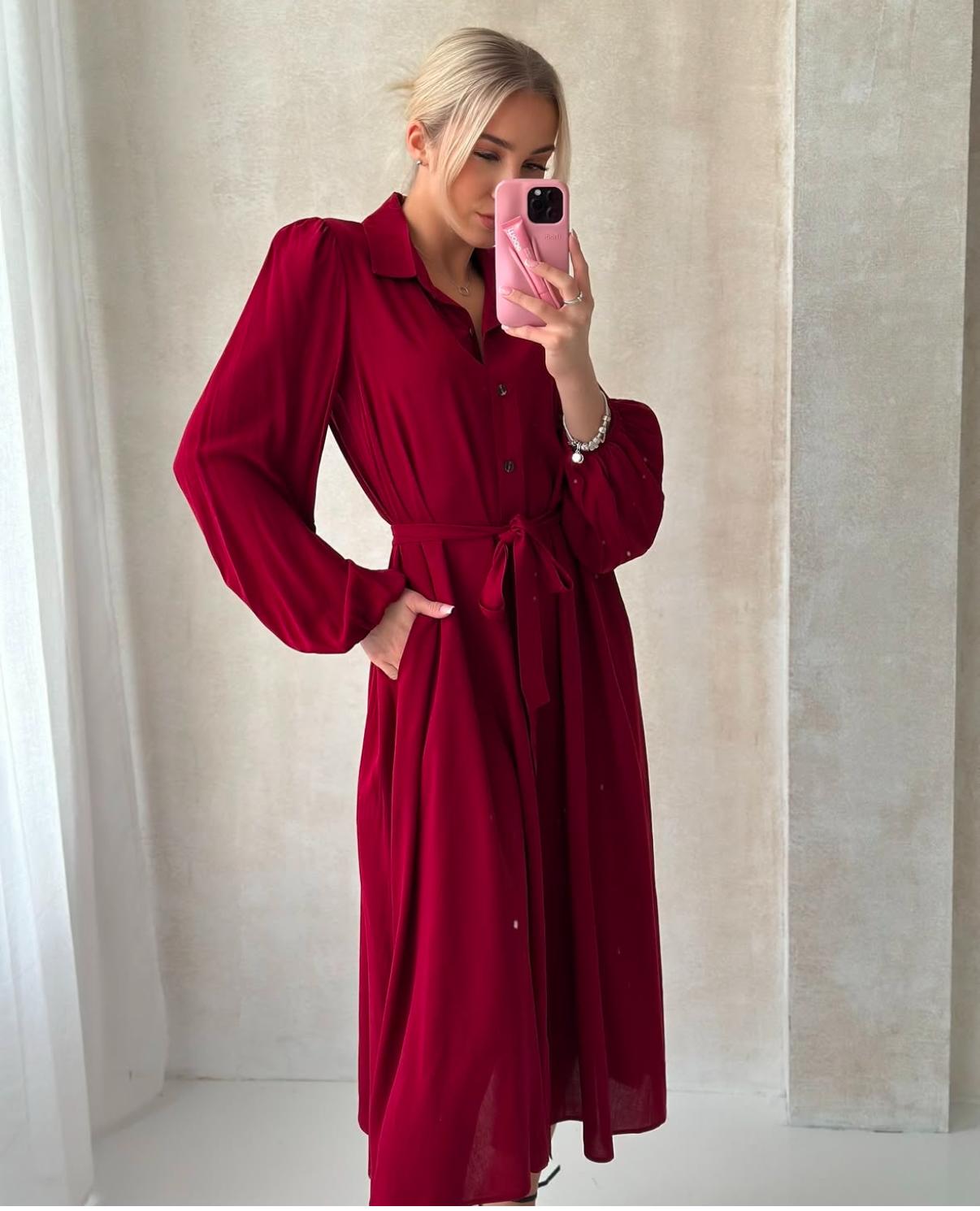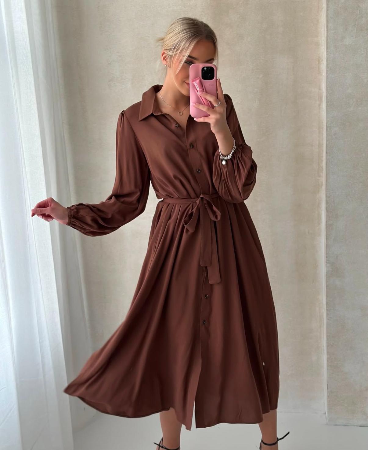 Koszulowa sukienka zapinana na guziki, którą można przewiązywać w pasie. Będzie idealna dla pań z brzuszkiem ciążowym.
