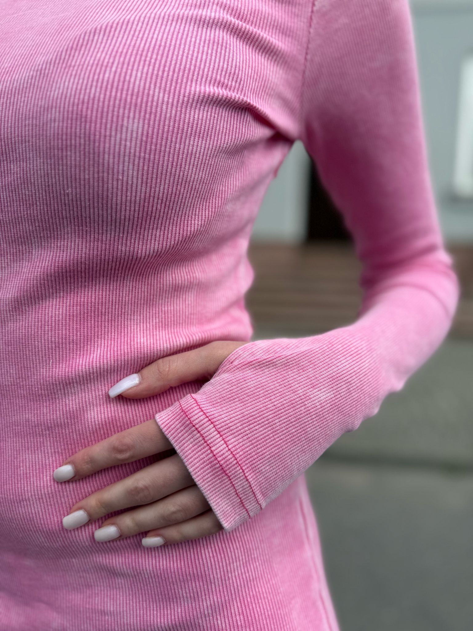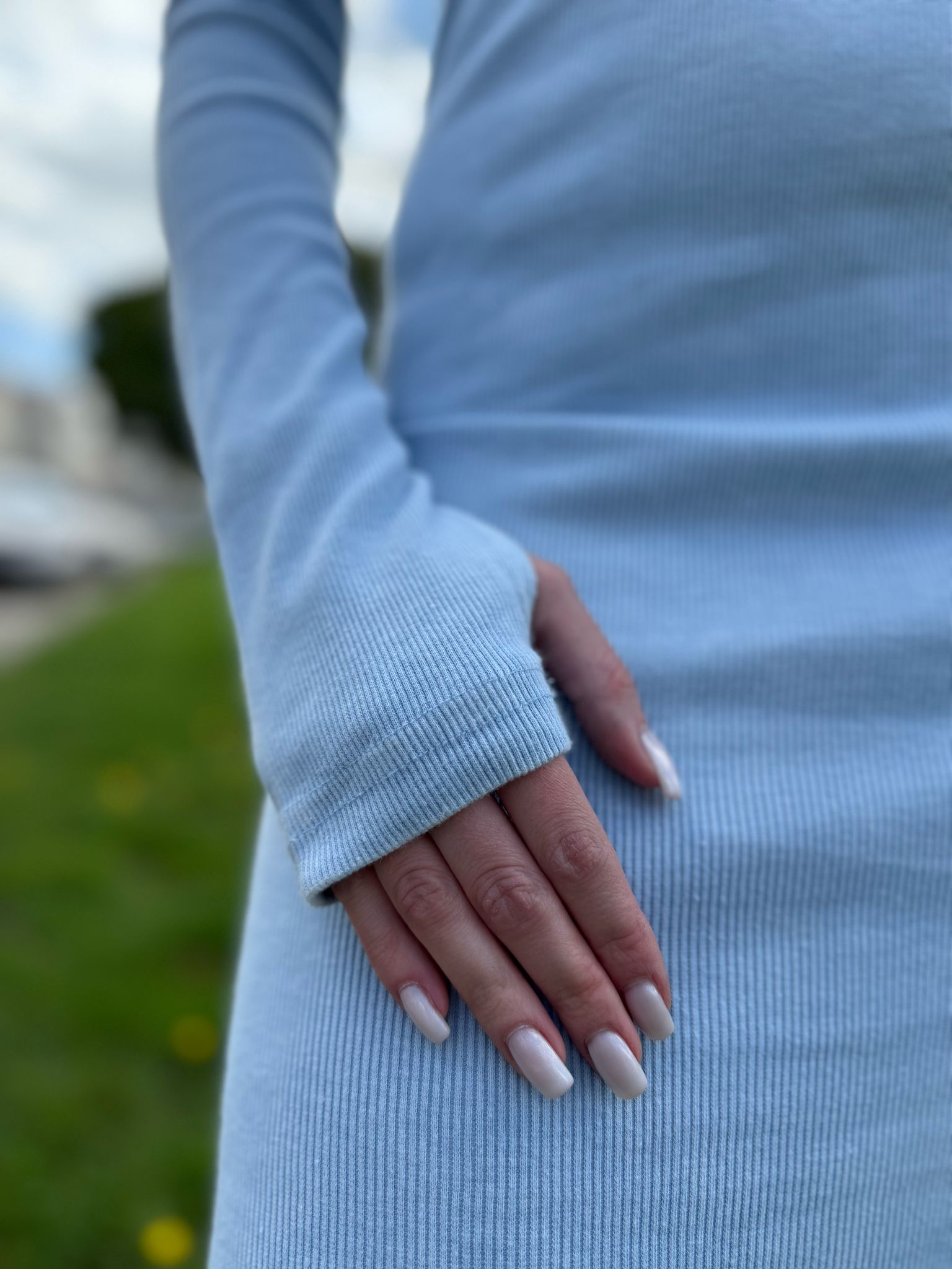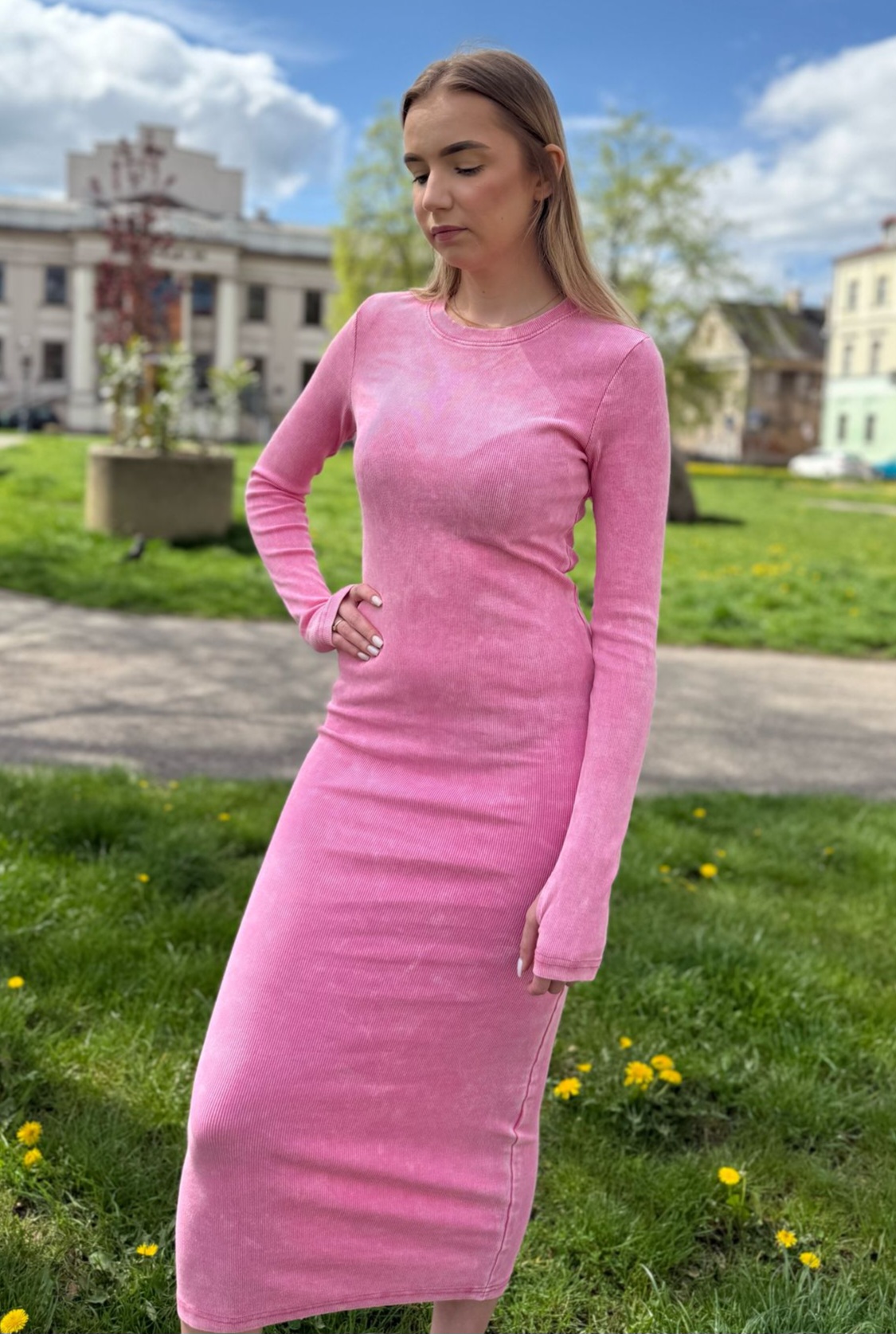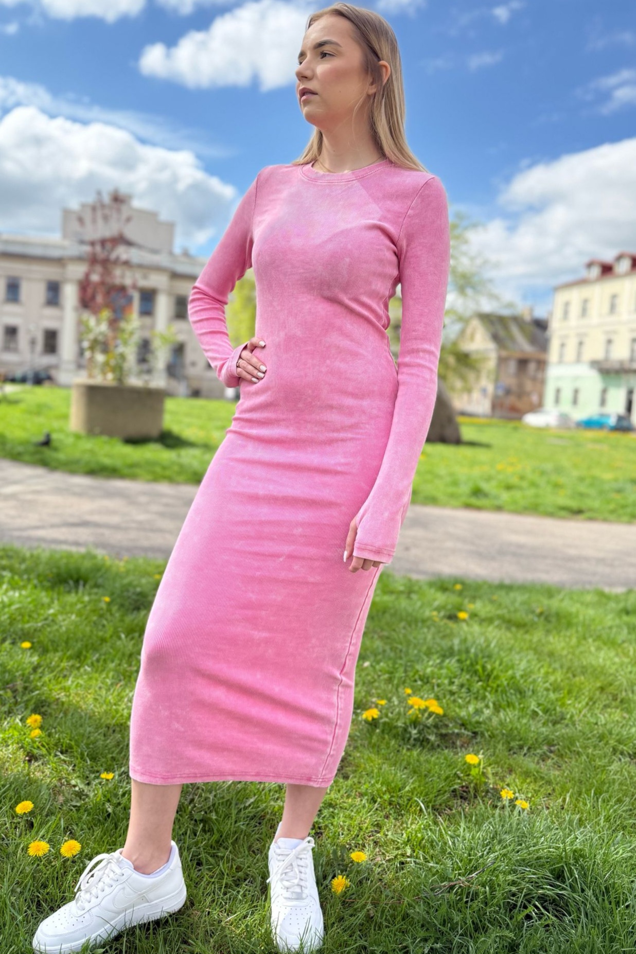 Dopasowana długa sukienka w rozmiarze uniwersalnym. Idealnie wygląda do butów sportowych, jak i w eleganckiej stylizacji. Posiada “dziurę” na kciuka, co wizualnie wydłuża rękaw.